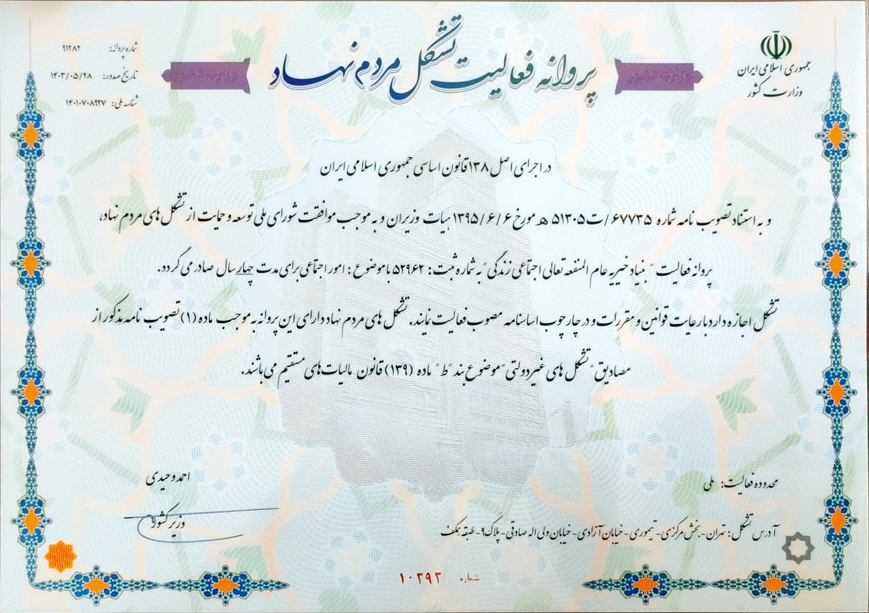 مجوز تاسیس بنیاد تعالی اجتماعی زندگی از وزارت کشور