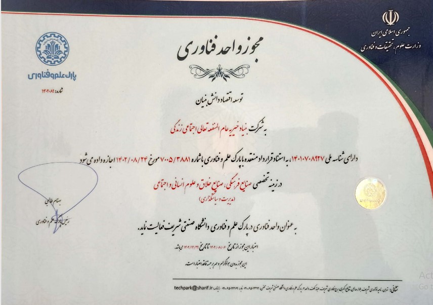 مجوز عضویت بنیاد تعالی اجتماعی زندگی در پارک علم و فناوری دانشگاه شریف