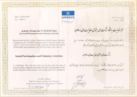 مجوز تاسیس باشگاه مشارکت‌های اجتماعی و فعالیت‌های داوطلبانه یونسکو