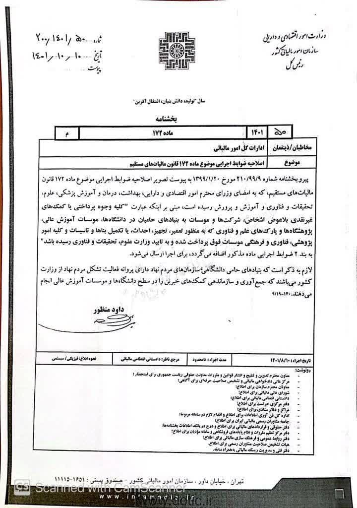 ابلاغ بخشنامه سازمان امور مالیاتی در خصوص بنیادهای حامیان دانشگاهی
